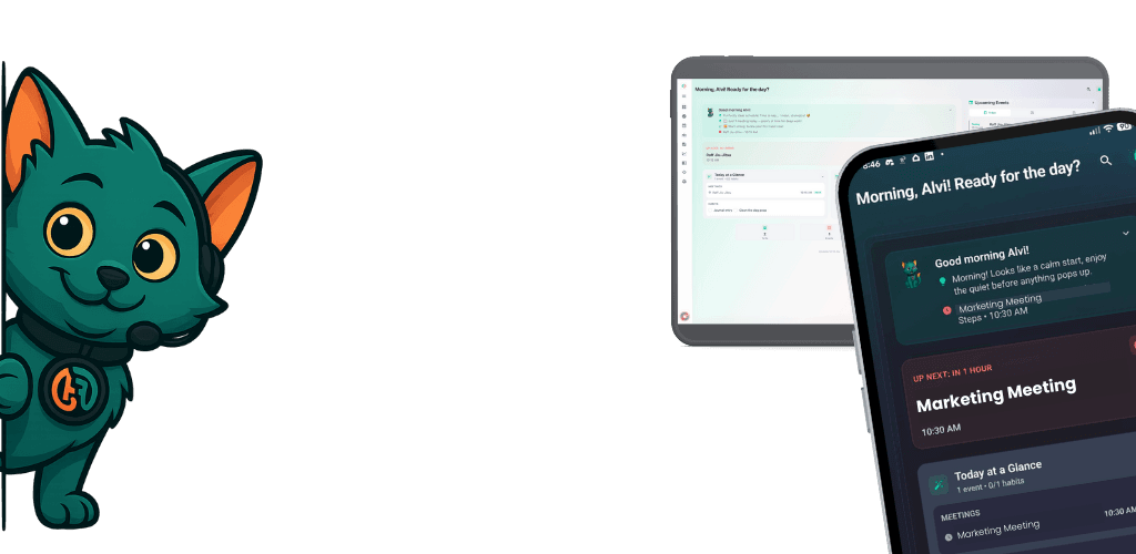 FloCat is your calm, smart sidekick. It learns your patterns and offers gentle nudges that reduce decisions rather than add more noise.